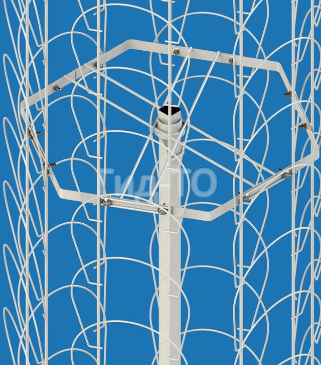 Вертушка під шапки виготовлена з дроту,, що робить її легкою і зручною в експлуатації. Тому її можна легко перенести, легко розібрати і зібрати знову, до того ж вона не займає багато місця і має презентабельний вигляд. Виріб складається з типовою підлогової стійки з чотирьох-променевої опорою підставою, і обертового барабана на 6 дисплеїв з кронштейнами. Всі дисплеї знімні, кріпляться до барабану за коштами болтів і гайок.